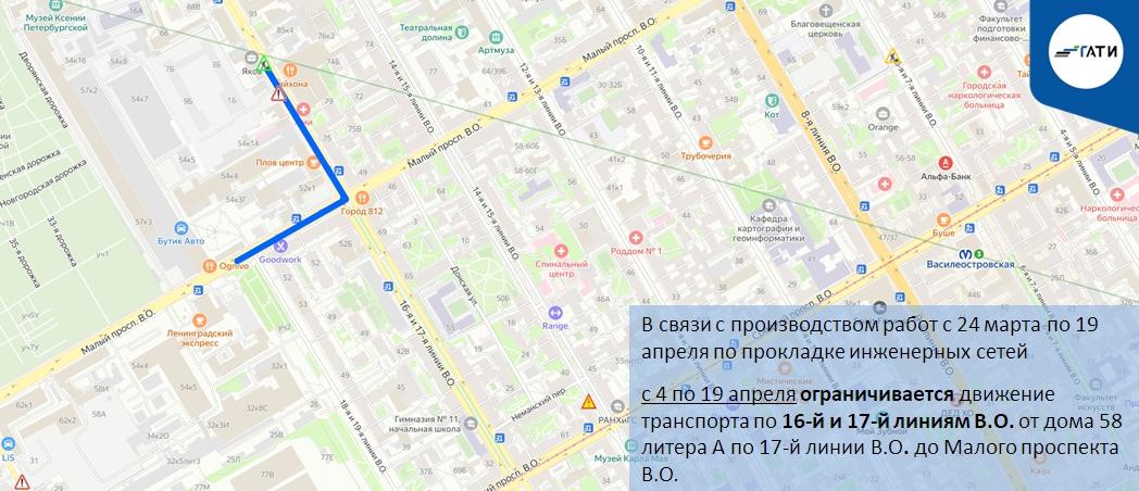 В Василеостровском районе с 4 по 19 апреля будет ограничено движение по 16-й и 17-й линиям Васильевского острова от дома 58, литер А по 17-й линии до Малого проспекта В.О. из-за прокладки инженерных сетей.