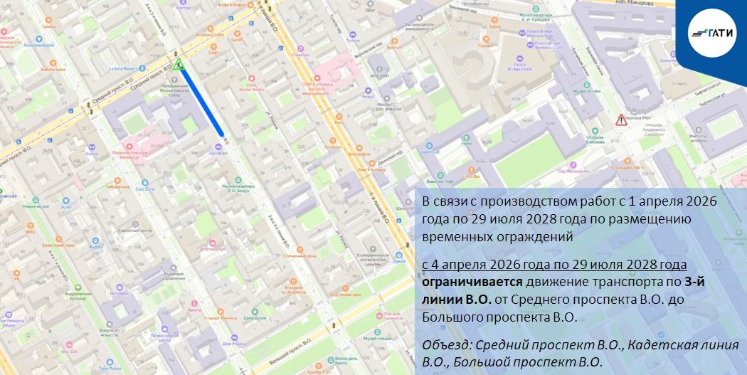 Кроме того, до 29 июля 2028 года проезд по 3-й линии В.О. от Среднего проспекта до Большого проспекта будет ограничен для размещения временных ограждений. Объезд возможен по Среднему проспекту В.О., Кадетской линии и Большому проспекту В.О.