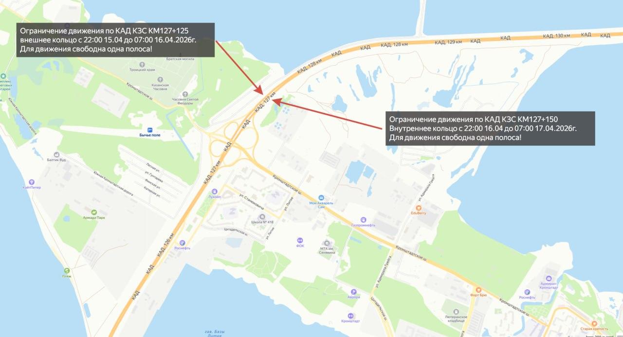 - С 22:00 15 апреля до 07:00 16 апреля закроют две полосы на участке со 127-го по 125-й километр внешнего кольца КАД.