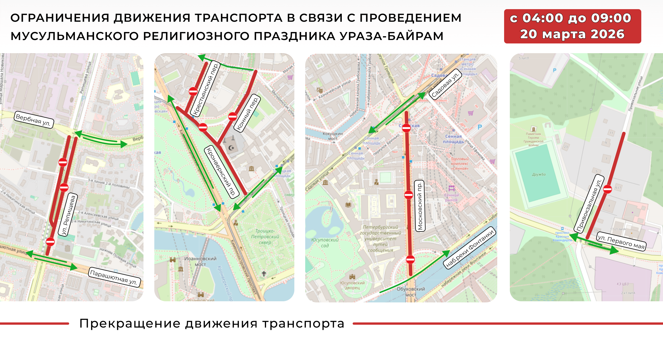 С 4:00 до 9:00 20 марта будет запрещён проезд по следующим участкам вблизи мечетей: