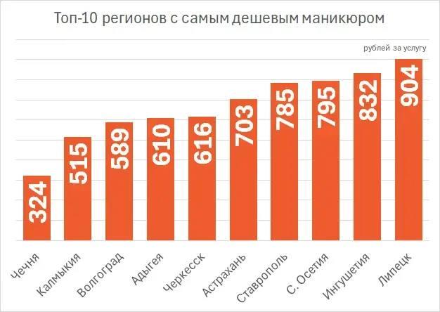 Самыми доступными регионами для получения маникюра оказались южные: в Чечне и Калмыкии средняя стоимость услуги не превышает 500 рублей.