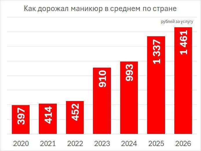 С 2020 по 2026 год средняя цена на маникюр по стране поднялась с 397 до 1461 рубля. В отдельных субъектах Российской Федерации рост оказался еще более существенным.