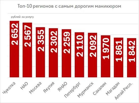 Наиболее дорогостоящей эта бьюти-услуга стала на Чукотке, где за маникюр просят 2652 рубля. Ненецкий автономный округ занимает вторую позицию с ценой в 2567 рублей. Столица, Москва, находится на третьем месте по стоимости.