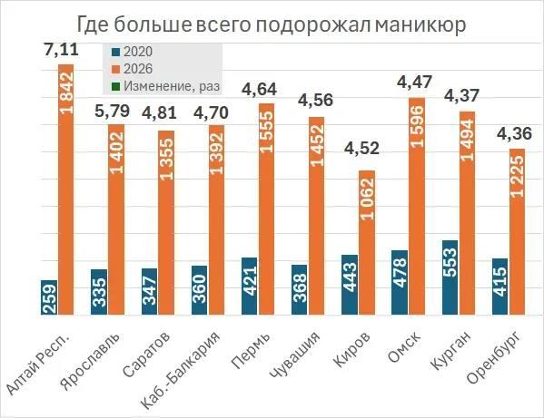 Среди регионов с максимальным ростом цен за пятилетний период лидирует Алтайская республика, где маникюр подорожал в семь раз. В Ярославле увеличение составило 5,79 раза, а в Саратове — 4,8.