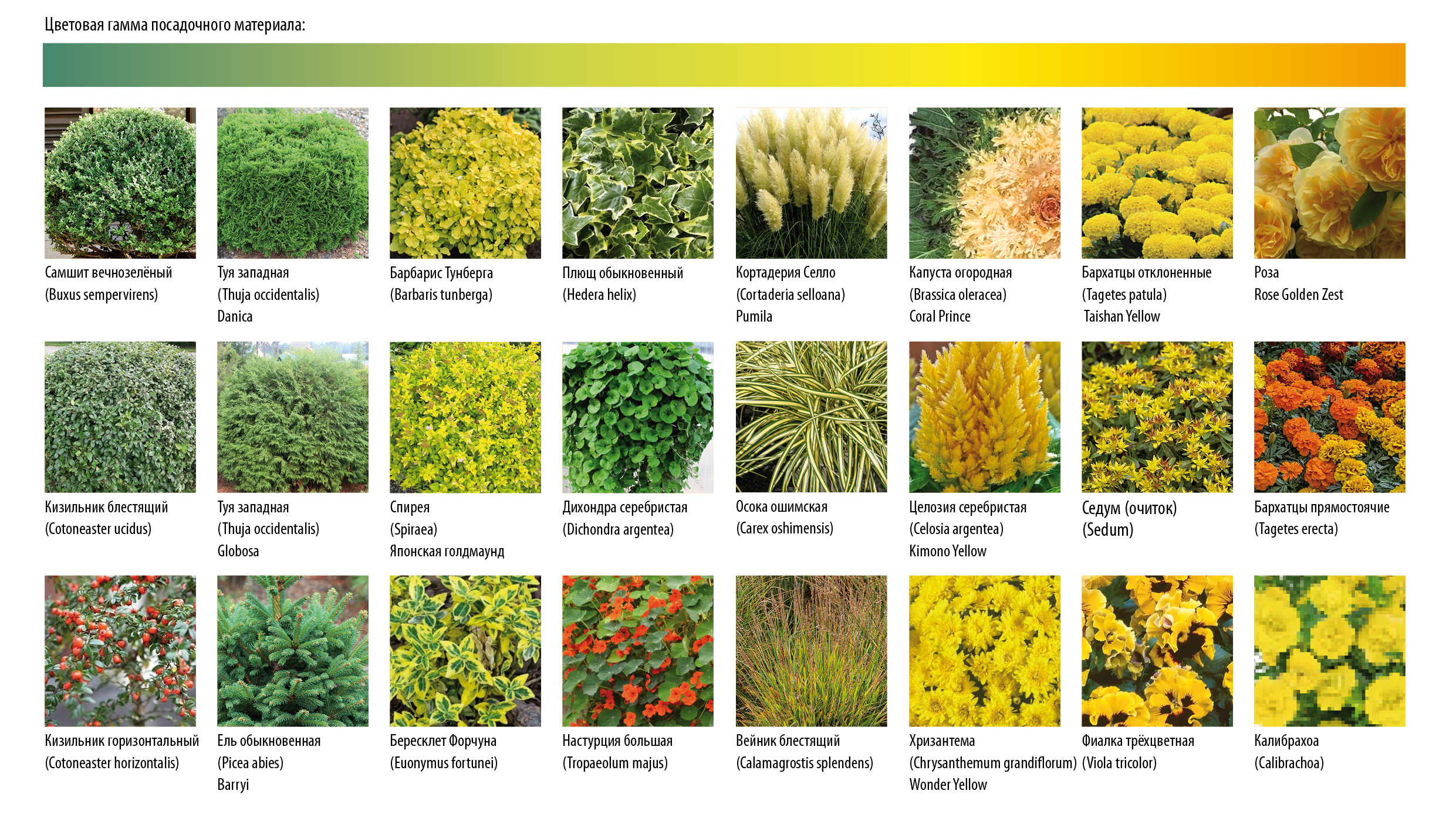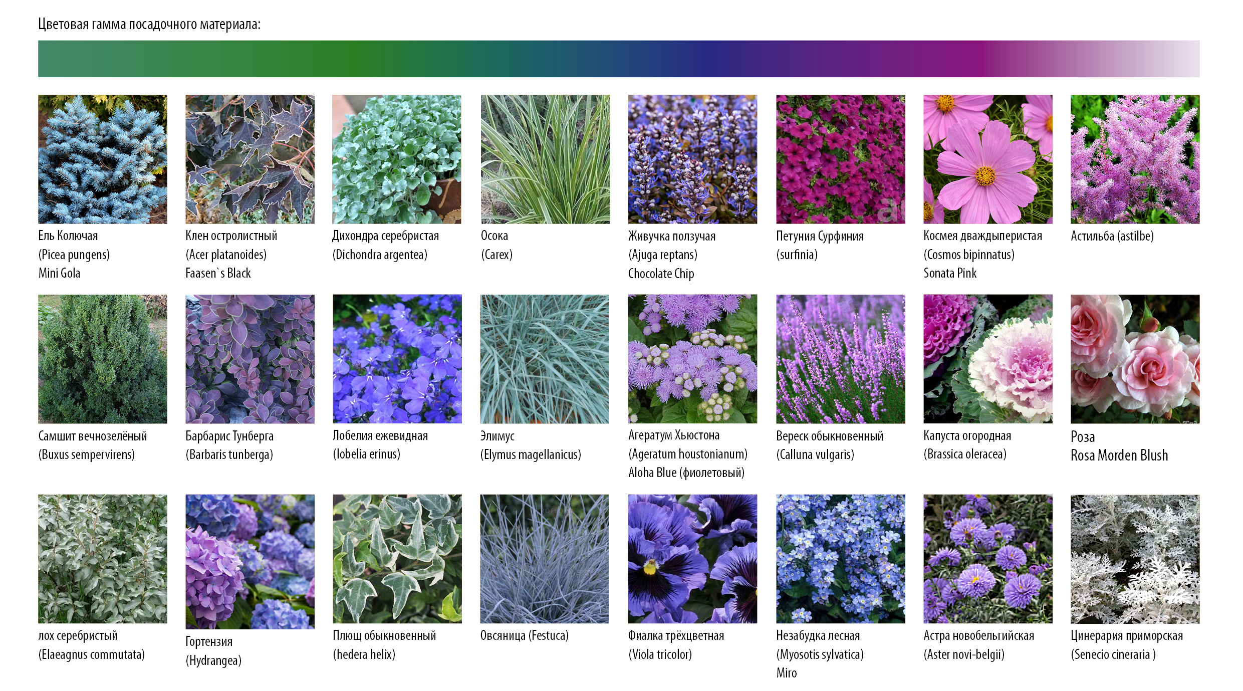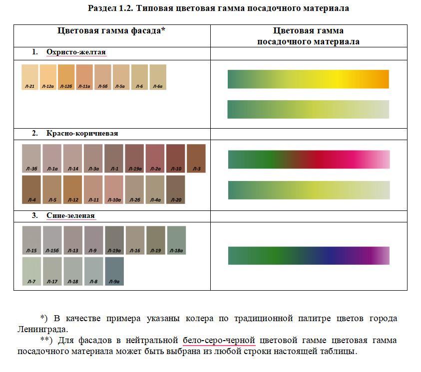 Допускаются комбинированные композиции. Также установлены цветовые сочетания растений в зависимости от окраски фасада:
