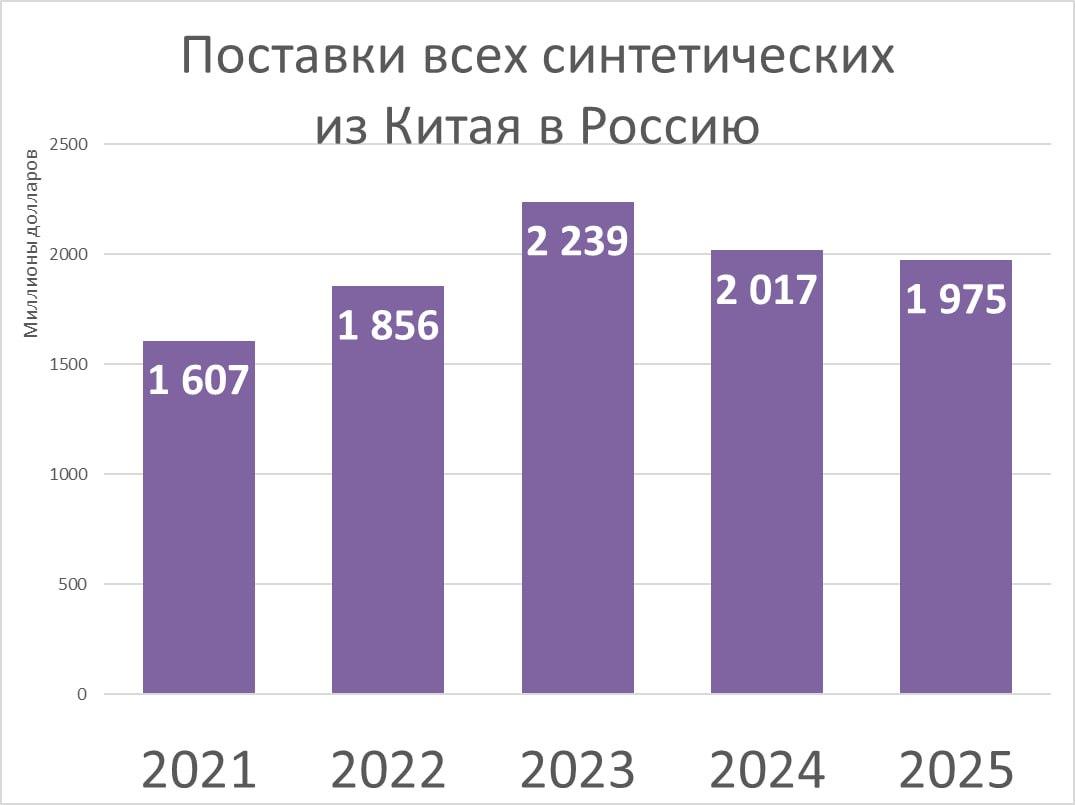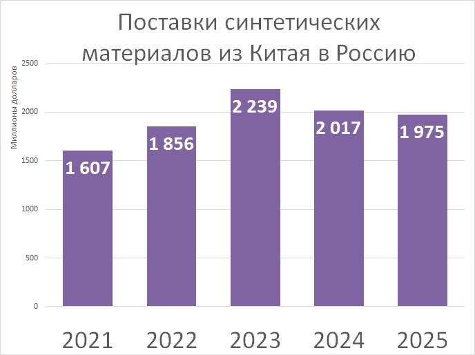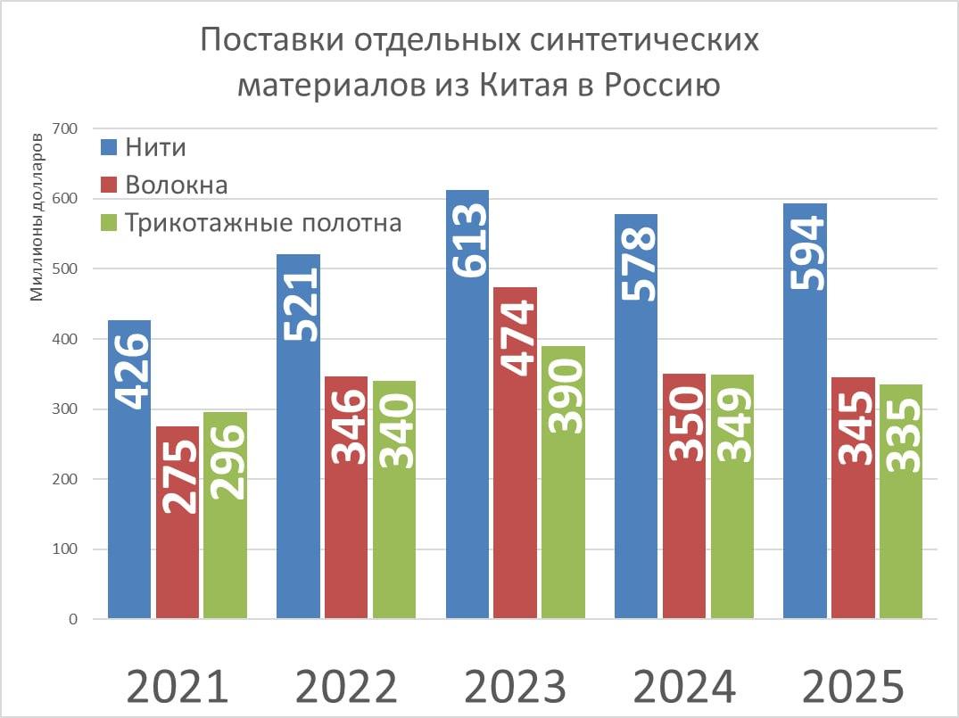 - Поставки синтетических нитей снизились с 613 млн долларов в 2023 до 594 млн в 2025.