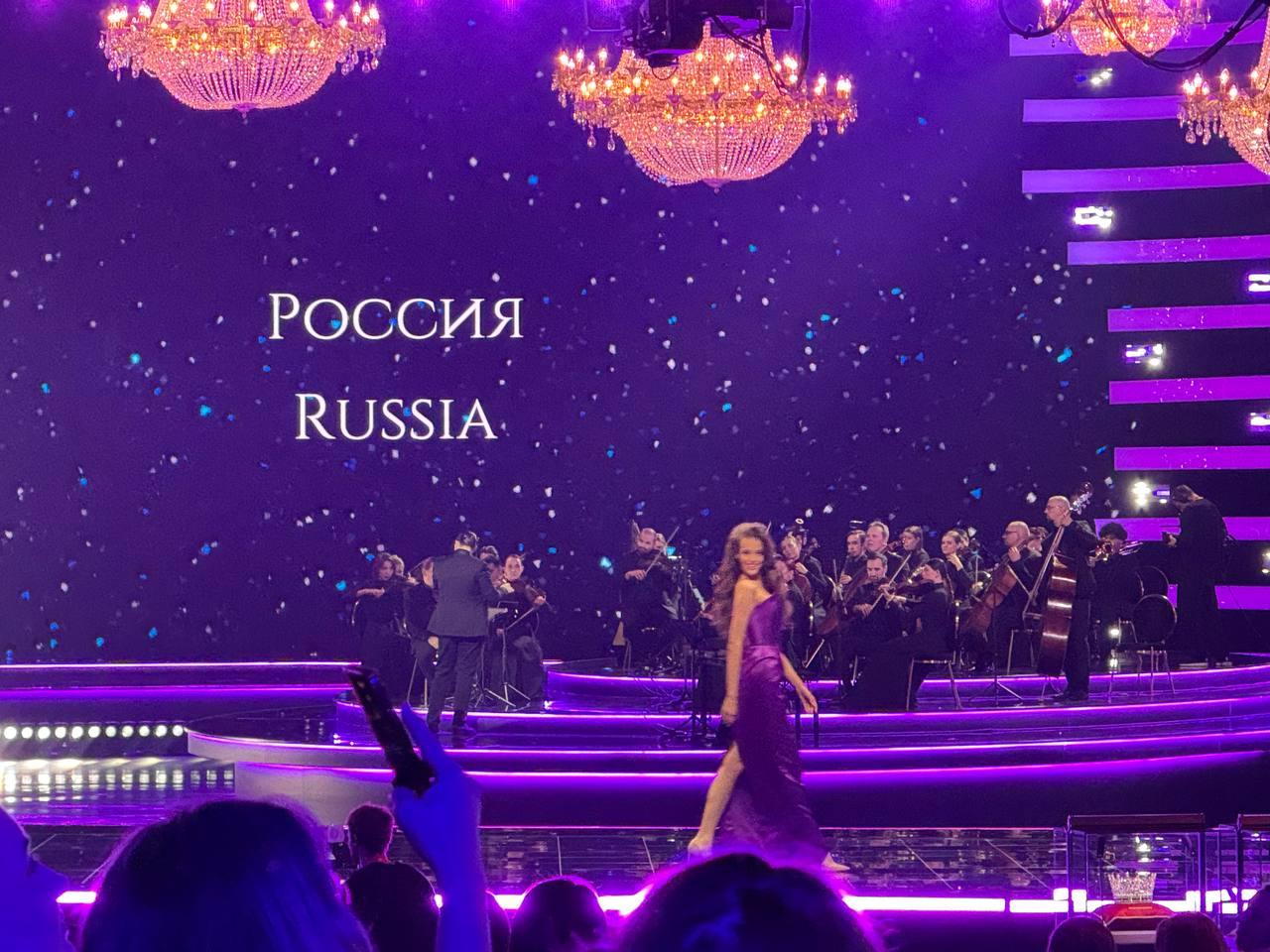 Российские участницы вышли на сцену в платьях цвета александрита — драгоценного камня, символизирующего страну.