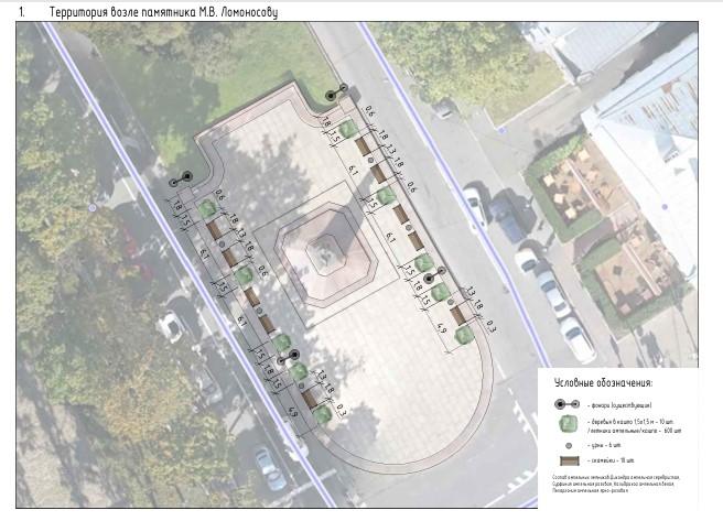 Зона возле монумента Ломоносову, расположенного на пересечении с Менделеевской линией, будет оборудована следующим образом: