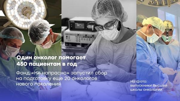 Петербургский фонд «Не напрасно» объявил о сборе 4,5 млн рублей для обучения 20 врачей-онкологов. Эти специалисты смогут ежегодно помогать тысячам пациентов по всей стране.