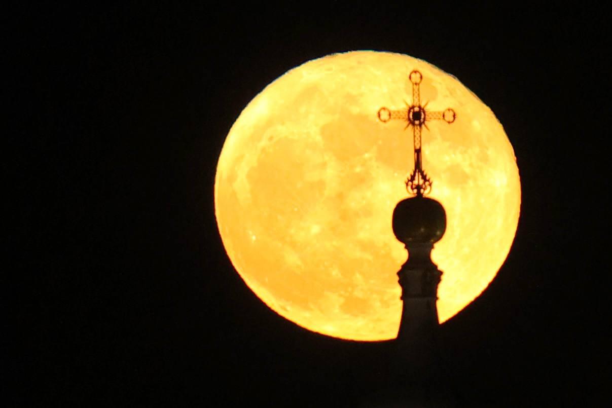 Полная луна на фоне башни Смольного собора в Санкт-Петербурге.