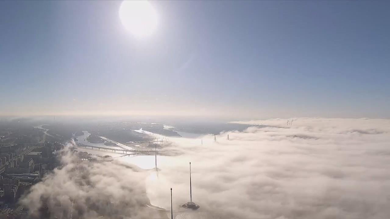 Утром 1 апреля Санкт-Петербург оказался во власти плотного тумана, который привел к массовому ДТП; явление засняли с башни «Лахта Центр».