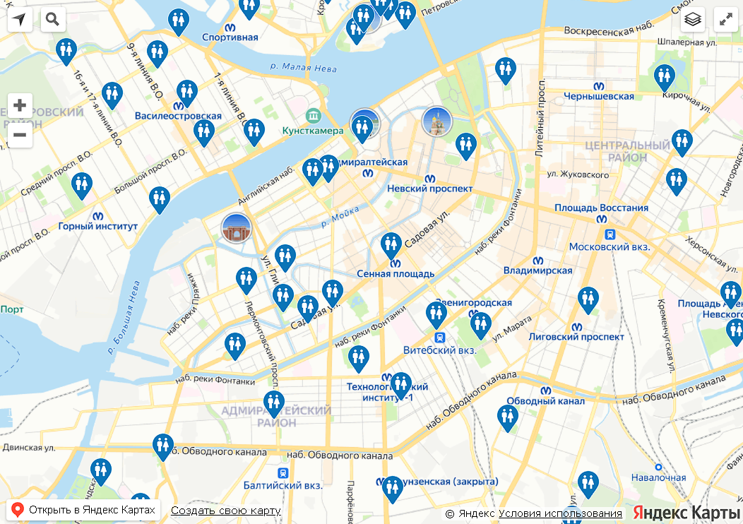 Узнать места расположения общественных туалетов, фонтанов и других объектов можно с помощью интерактивной карты на сайте Водоканала.