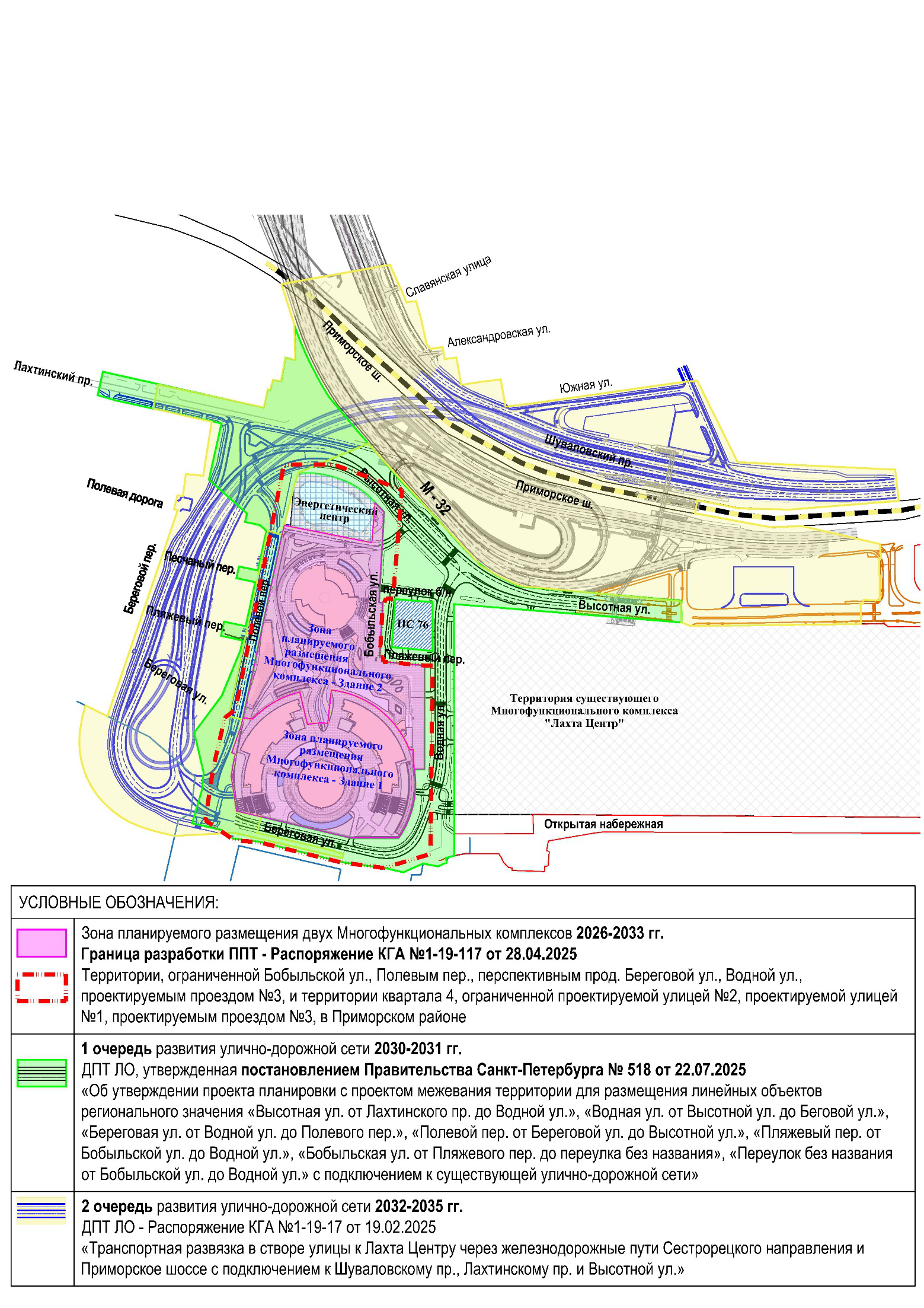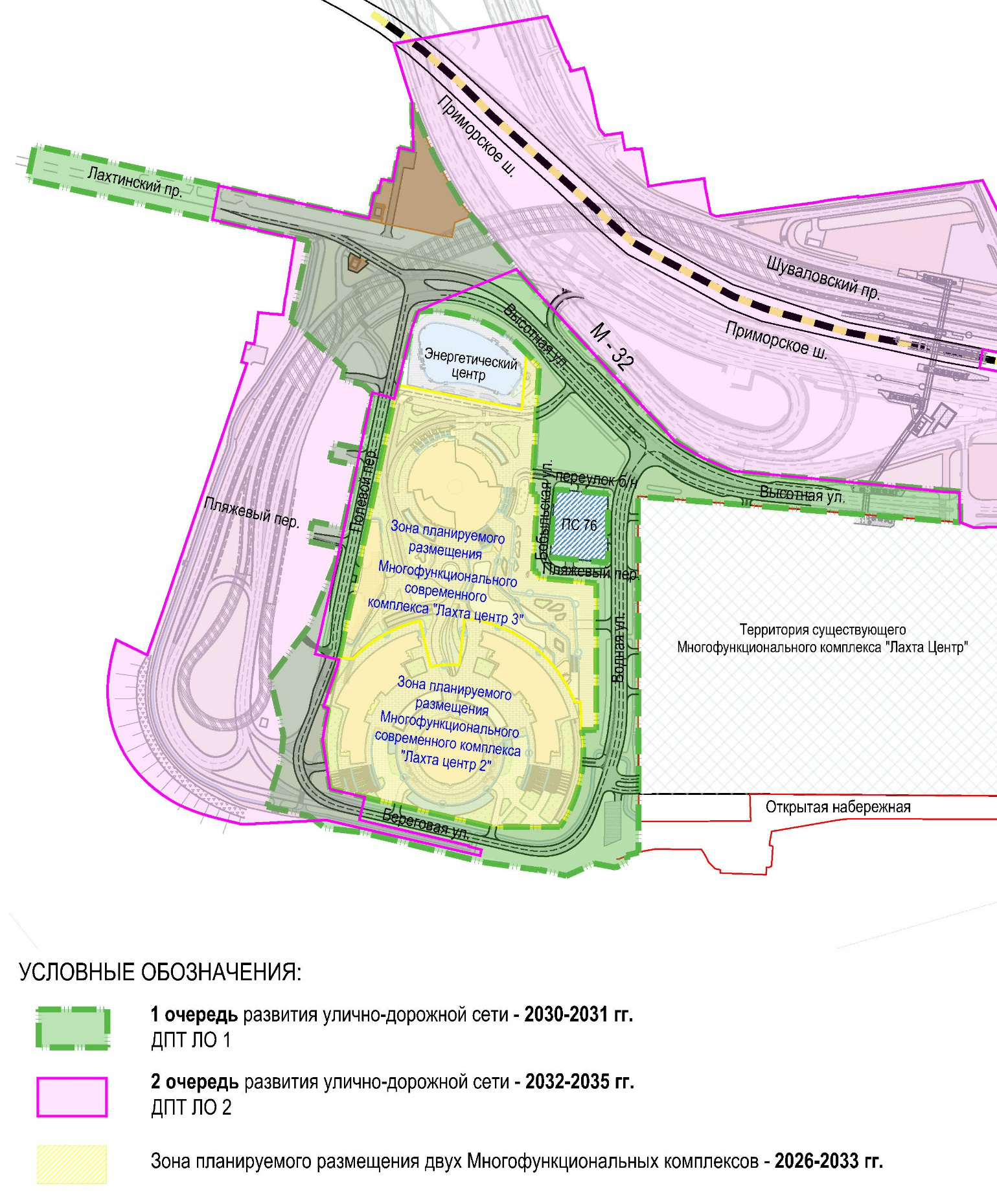 Вторая очередь (2032–2035 годы) предусматривает строительство транспортной развязки через железнодорожные пути Сестрорецкого направления, а также развитие Приморского шоссе с подключением к Шуваловскому и Лахтинскому проспектам и Высотной улице. Полноценную связь с городской сетью обеспечит путепровод магистрали М-32.