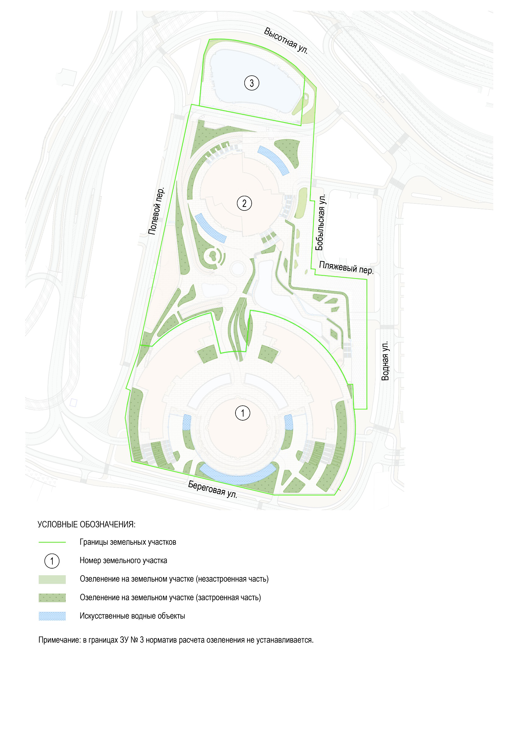 План озеленения территории с указанием зон зеленых насаждений и искусственных водных объектов.