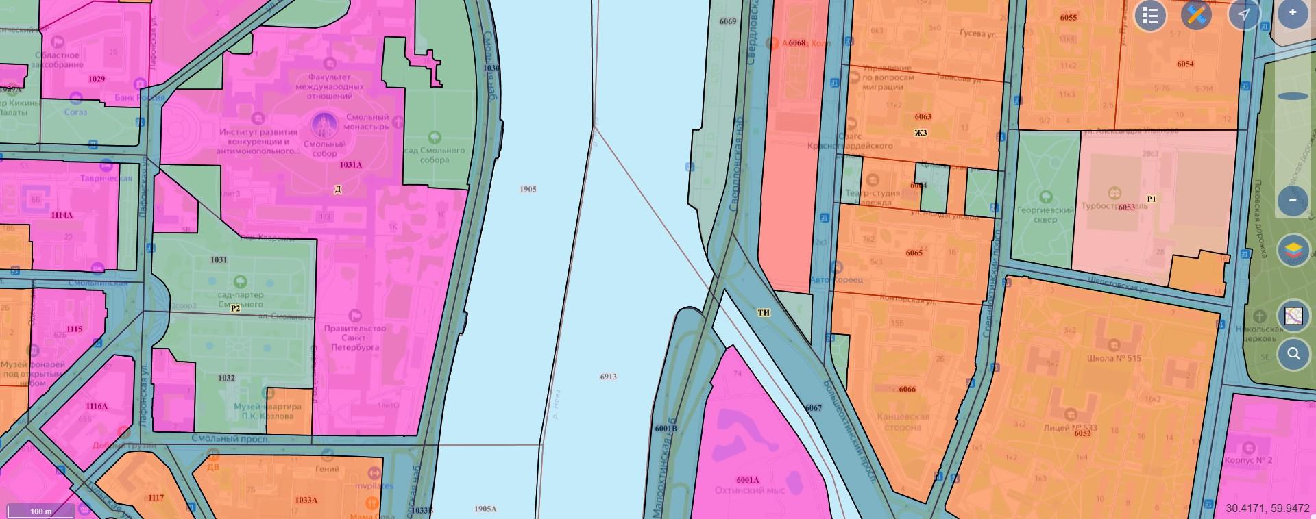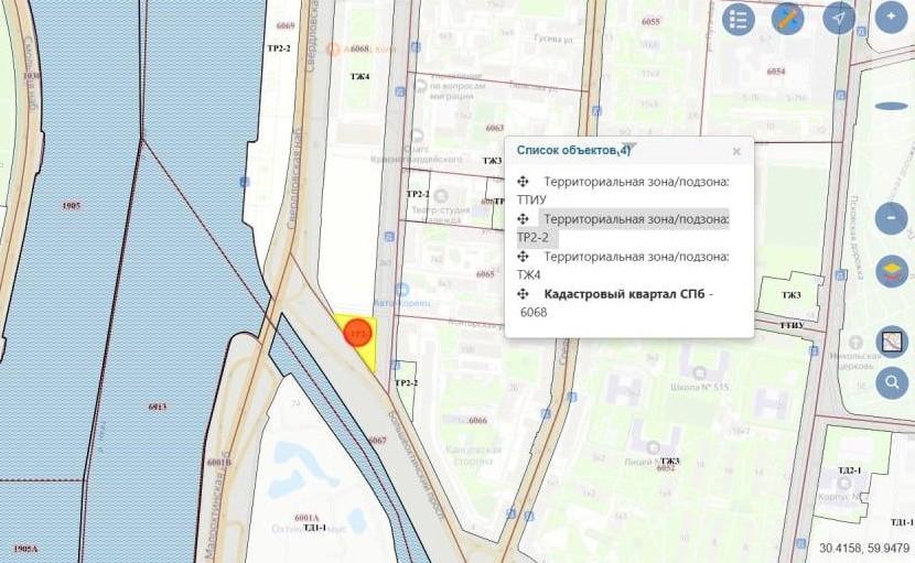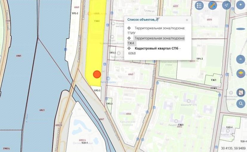 По Генеральному плану Петербурга, основная часть участка предназначена для многоэтажной жилой застройки (зона Ж4). Лишь небольшой южный треугольник относится к рекреационной зоне и является объектом культурного наследия.