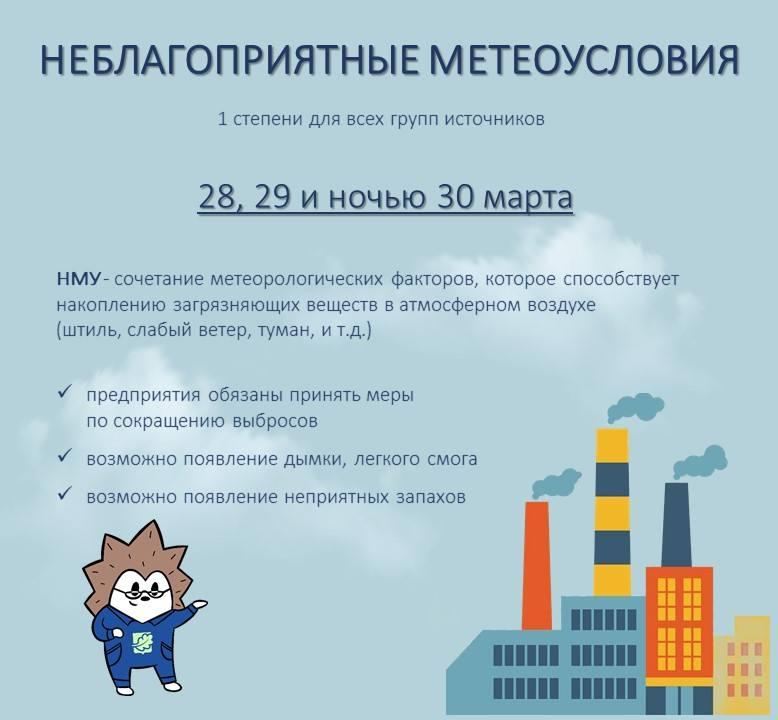 ГУ МЧС объявило, что с 28 по 30 марта в Санкт-Петербурге ожидаются неблагоприятные метеоусловия (НМУ), способствующие загрязнению атмосферы. По данным ФГБУ «Северо-Западное УГМС», аналогичный прогноз распространён на Ленинградскую, Псковскую, Калининградскую и Новгородскую области.