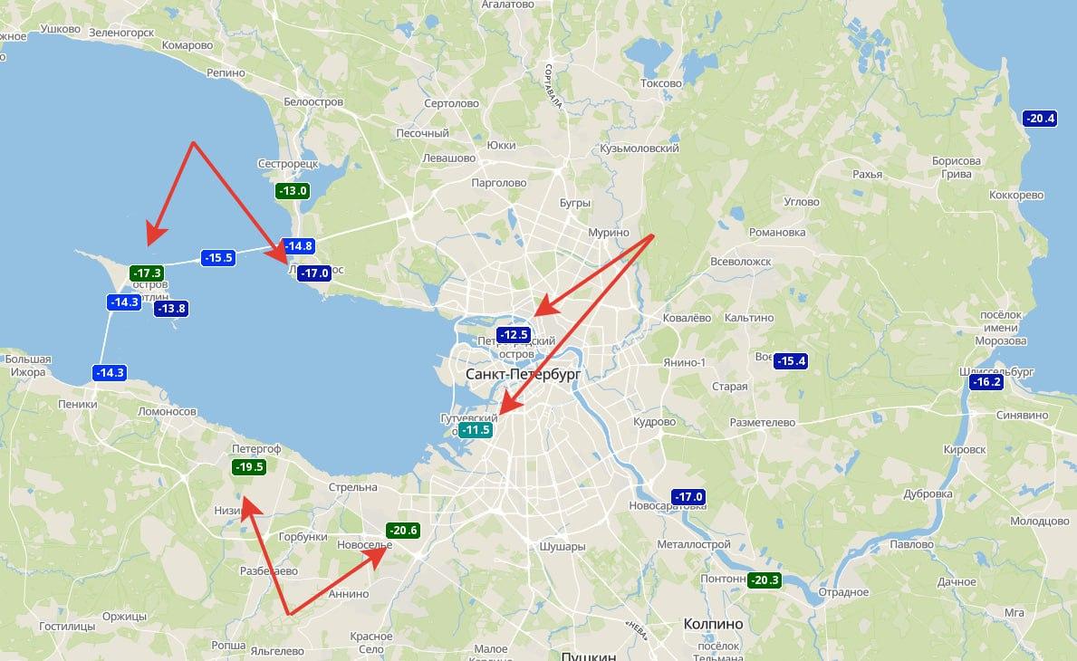«Обратите внимание на распределение температуры воздуха по территории Санкт-Петербурга. Разница между центром города и его окраинами значительная. Постоянно приходится говорить в интервью о разнице температур до 8 градусов в Санкт-Петербурге в тихую ясную ночь зимой. Вот сегодня снова конкретное подтверждение такого процесса», — отметил Колесов.