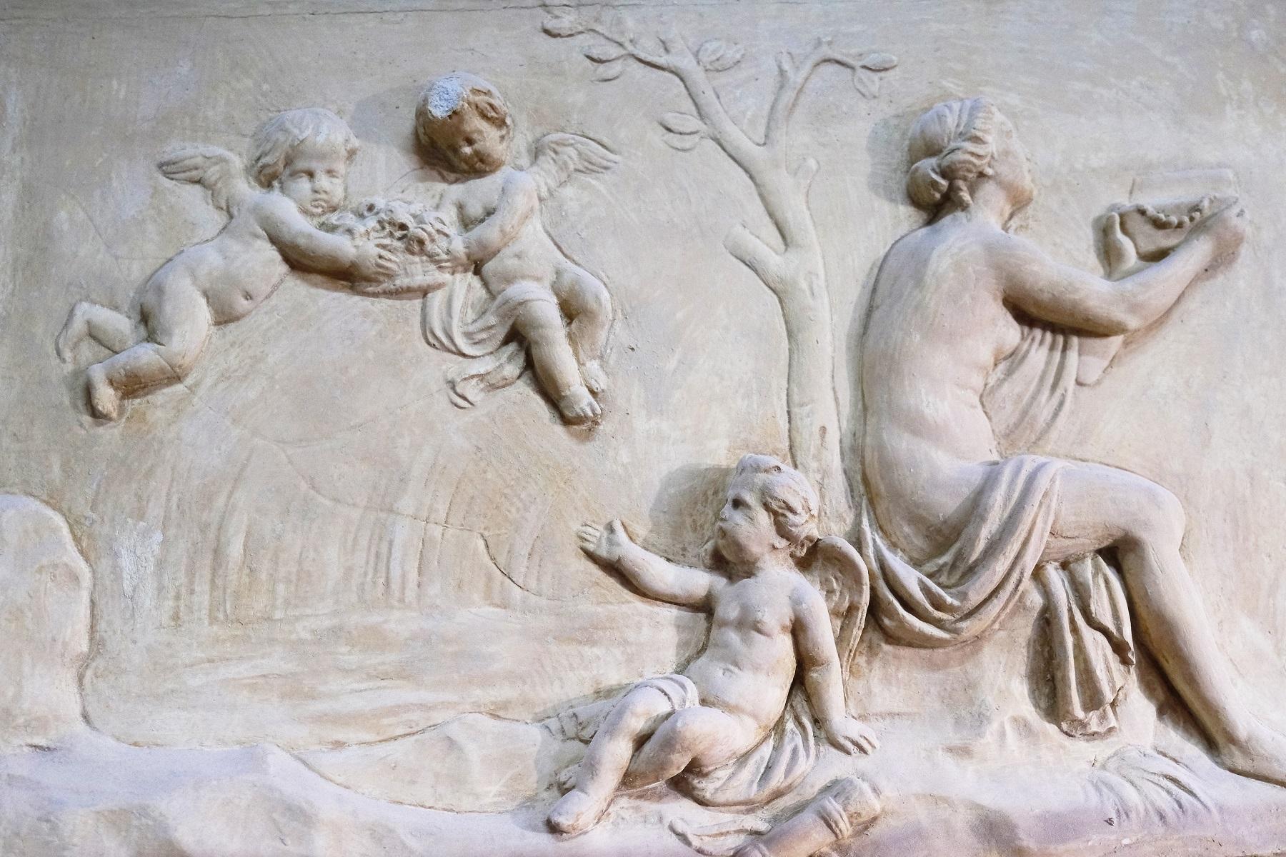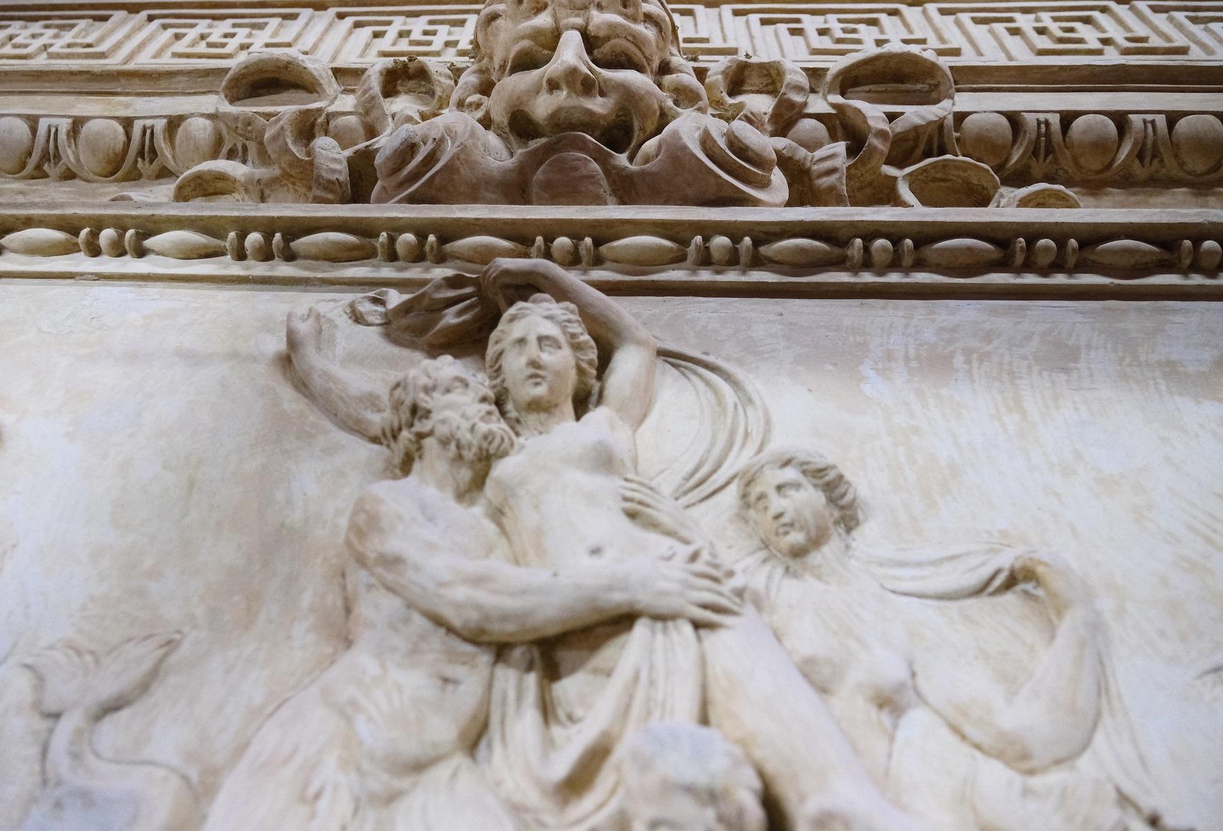Рядом с портретами размещены барельефы с сюжетами из античной мифологии, вероятно, связанными с богиней моря Амфитритой. Изображены сцены «Побег Амфитриты», «Похищение Амфитриты» и «Триумф Амфитриты».