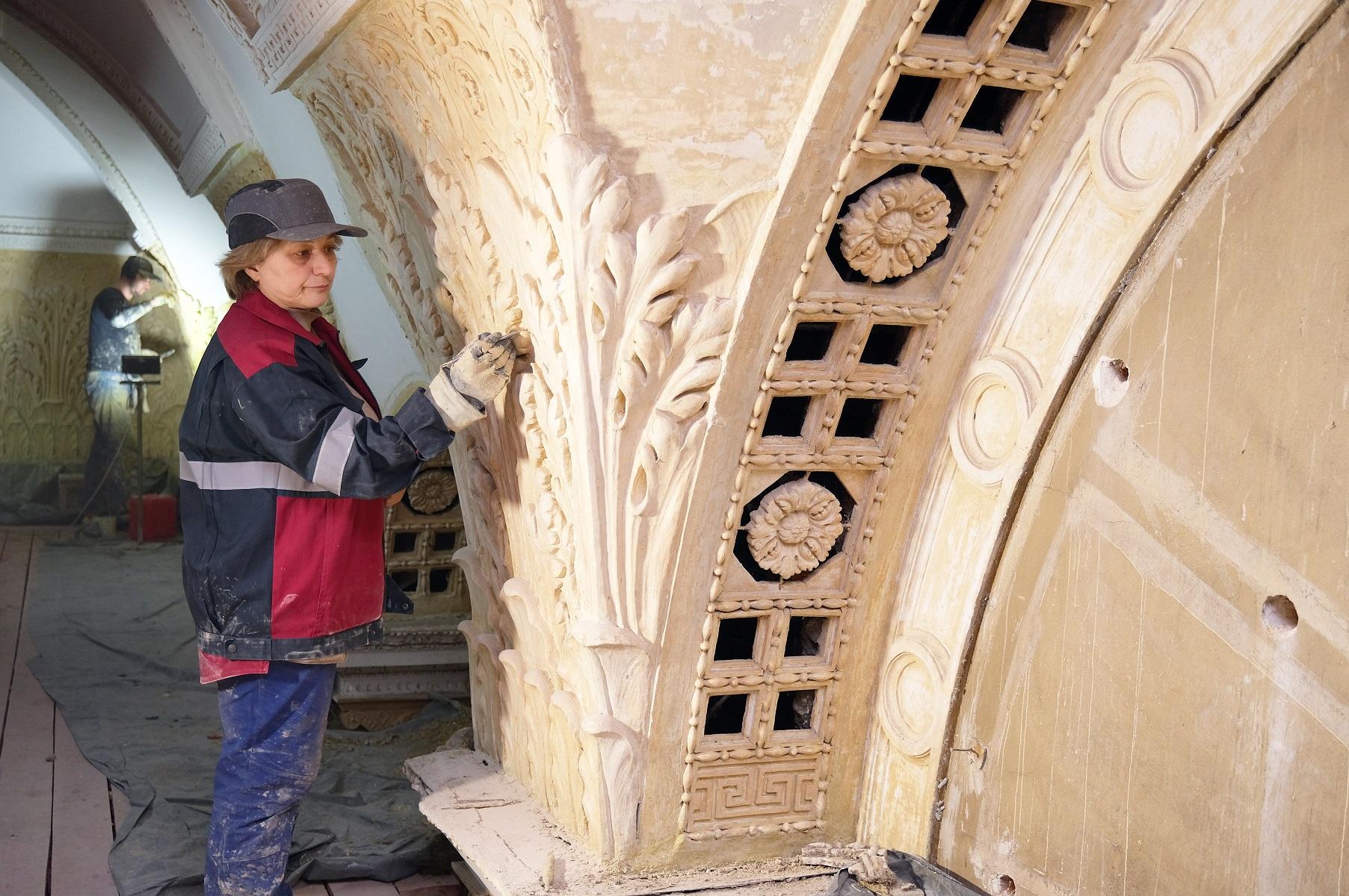 Художник-реставратор Нелли Ефендиева за расчисткой лепного декора.