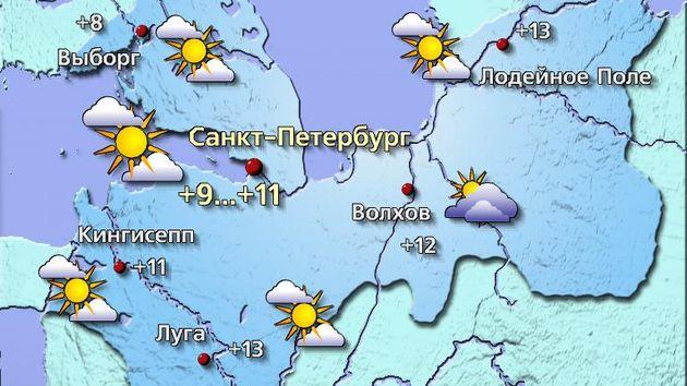 По данным метеорологического центра «ФОБОС», на погоду в Петербурге сегодня влияет барический гребень, протянувшийся с запада. Это принесёт малооблачную погоду без осадков. Несмотря на обилие солнечных лучей, значительного повышения температуры не предвидится из-за западных ветров с Финского залива, несущих прохладу. Воздух прогреется до +9…+11 градусов в городе и до +8…+13 в Ленинградской области. Ветер будет западным со скоростью 4–9 м/с. Атмосферное давление стабильно и составит 765 мм рт. ст., что выше климатической нормы.