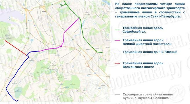 - трамвайная линия от станции метрополитена «Южная» (известной также как «Шушары») до города Колпино;