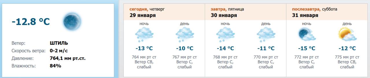 - Пятница, 30 января: ночью -13…-15°C, а в районах с прояснениями столбик термометра может опуститься до -18…-20°C. Днем температура составит -10…-12°C, местами возможен небольшой снег.