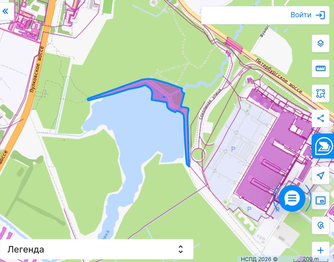 Контур гидротехнического сооружения Пулковского водохранилища выделен на плане синим цветом