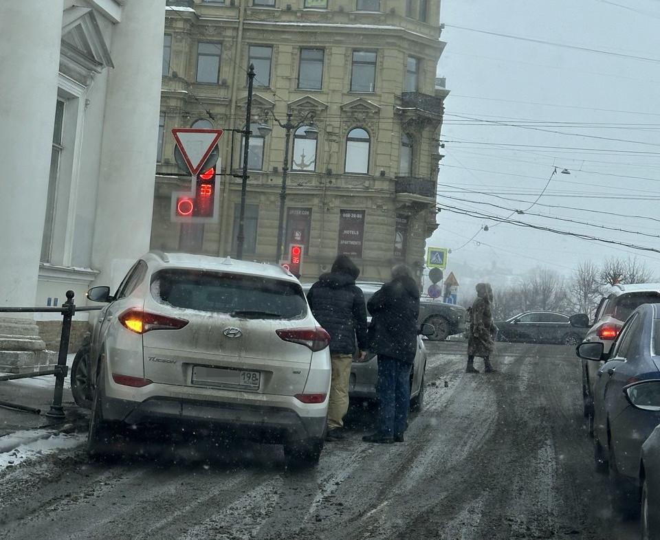 Днем 2 февраля в центральной части Санкт-Петербурга на перекрестке Невского проспекта образовался затор из-за дорожной аварии.