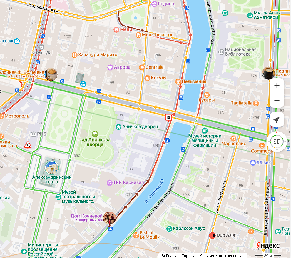 В результате инцидента была перекрыта полоса для правого поворота с набережной Фонтанки на Невский проспект. Данные сервиса «Яндекс.Пробки» показали скопление транспорта на нечетной стороне Фонтанки в направлении от площади Ломоносова.