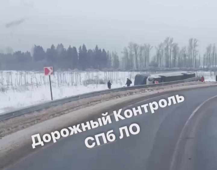В Ленинградской области автобус съехал в кювет и опрокинулся. Несколько человек госпитализированы с травмами.