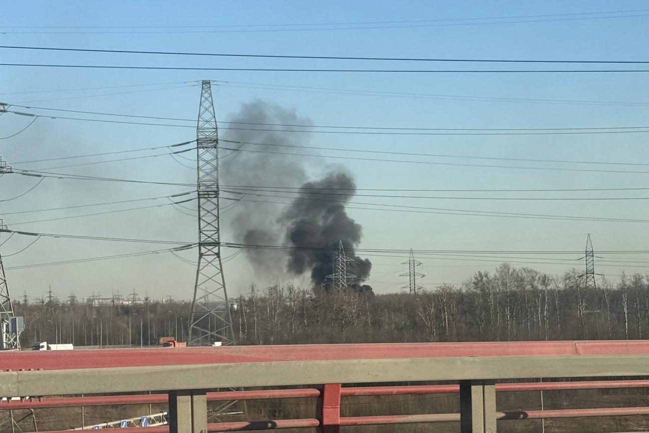В Колпинском районе Санкт-Петербурга произошел крупный пожар. На частной заправке загорелись два бензовоза, образовав столб черного дыма.