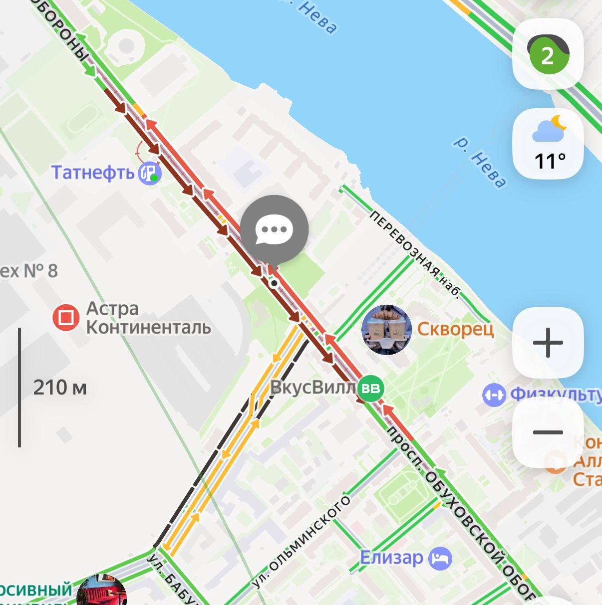 Пробка на проспекте Обуховской Обороны протянулась от дома 28 до сада Фонтанчик у дома 85.