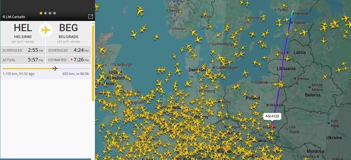 Согласно данным Flightradar24, борт преодолел большую часть пути к Белграду. Ожидается, что из сербской столицы он затем отправится в Санкт-Петербург.