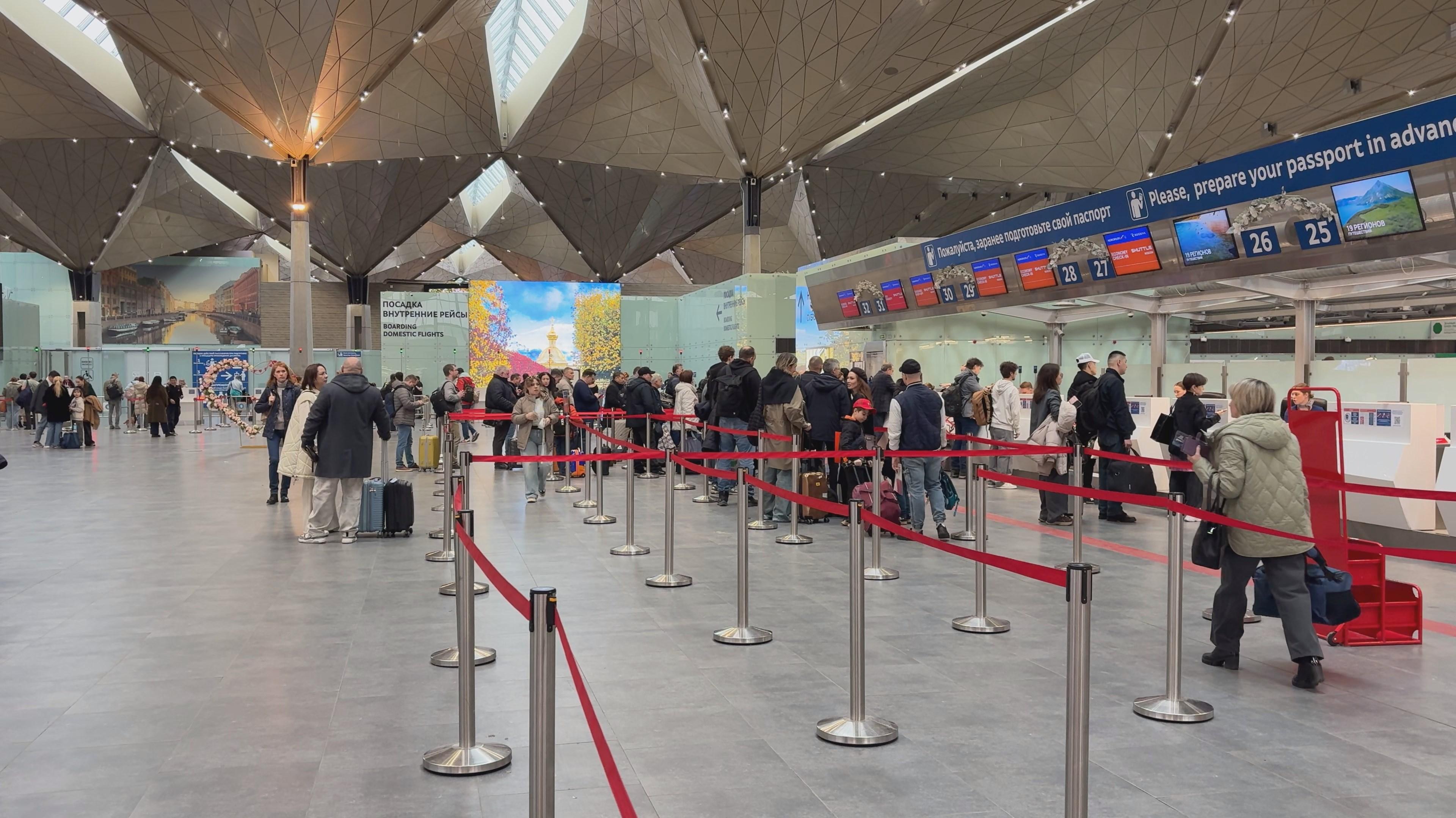 К вечеру 25 марта в петербургском аэропорту Пулково задерживается вылет 22 рейсов. Задержки превышают два часа и связаны с последствиями массированной атаки беспилотных летательных аппаратов на Ленинградскую область.