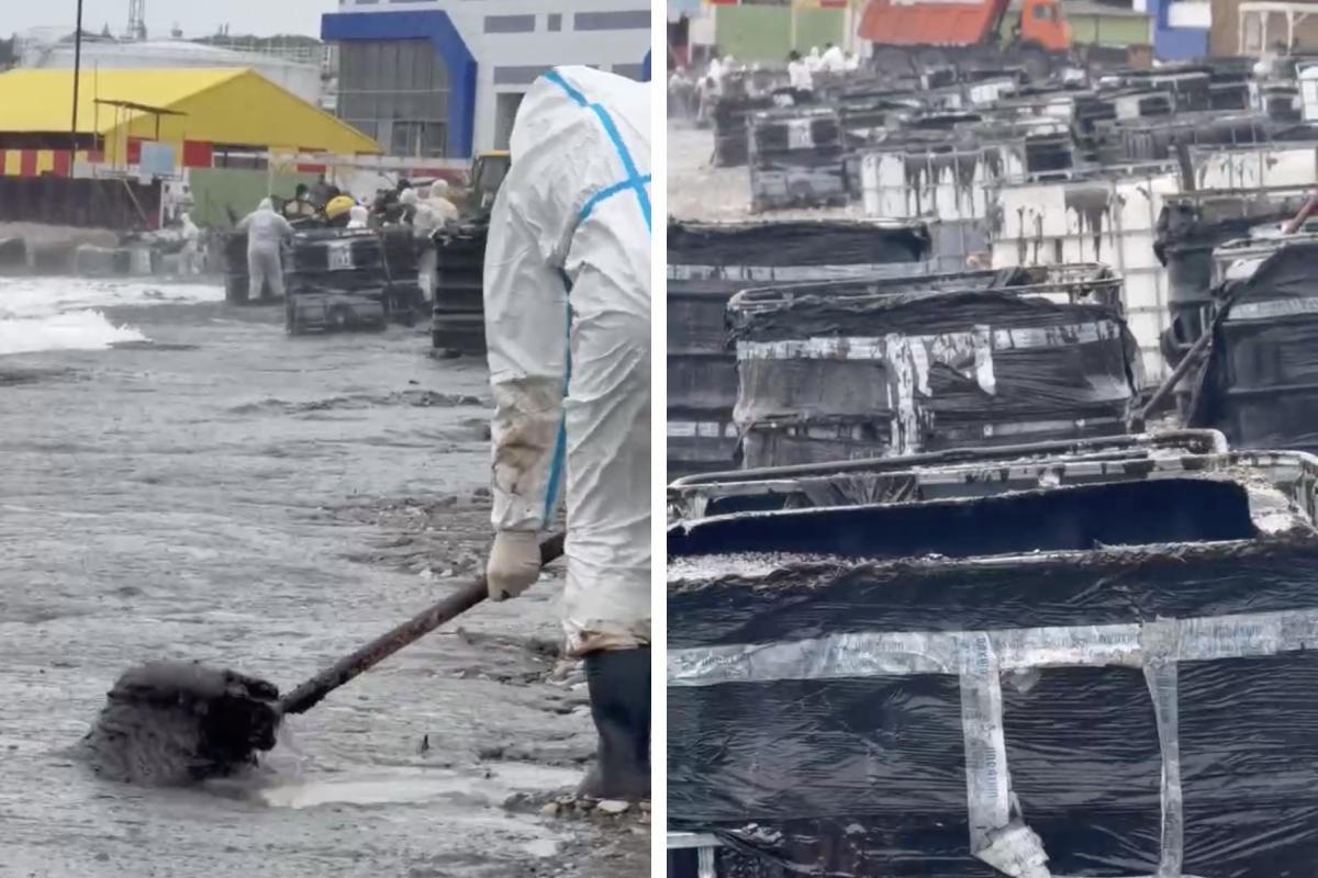 Мазут собирают в большие металлические бочки на берегу
