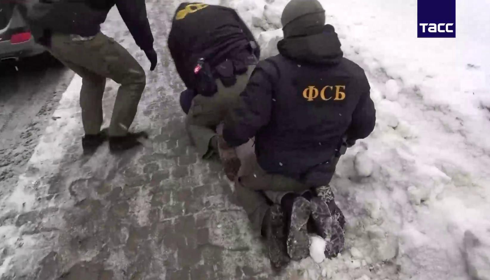 Федеральная служба безопасности России обнародовала кадры задержания, датированные 30 января. На записи видно, как оперативники удерживают подозреваемого лицом в снегу и конфискуют оружие.