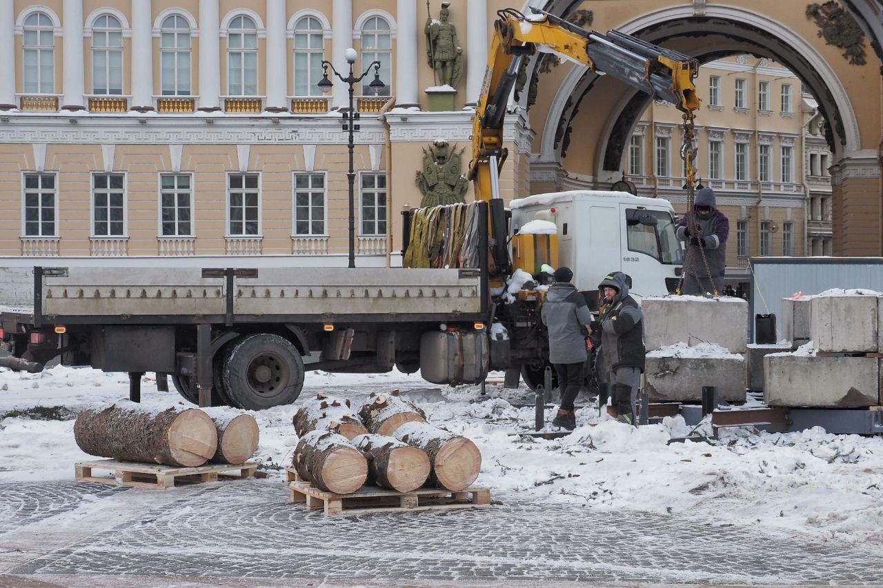 Главная праздничная ель, которая украшала Дворцовую площадь, окончательно убрана. В последний день января на площади остались лишь подготовленные к вывозу части её ствола.