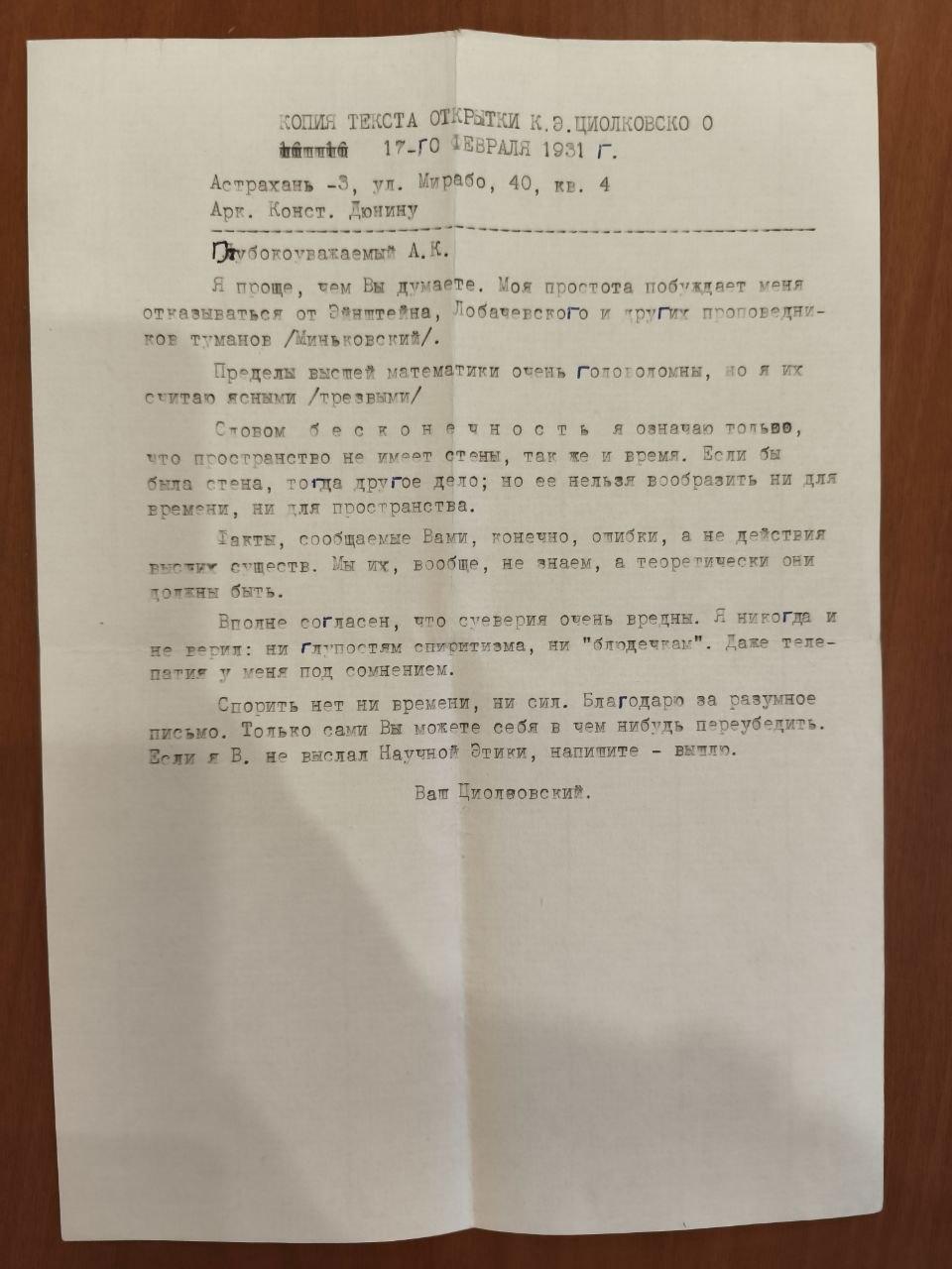 В публикации содержится цитата: «Увидел на „Фонтанке“ публикацию о том, что в аукционном доме в Петербурге уйдет с молотка письмо основоположника космонавтики Константина Эдуардовича Циолковского, написанное им в 1931 году. Есть предложение к потенциальному покупателю — после приобретения передать его в дар музею Циолковского в школе № 521 Красногвардейского района».