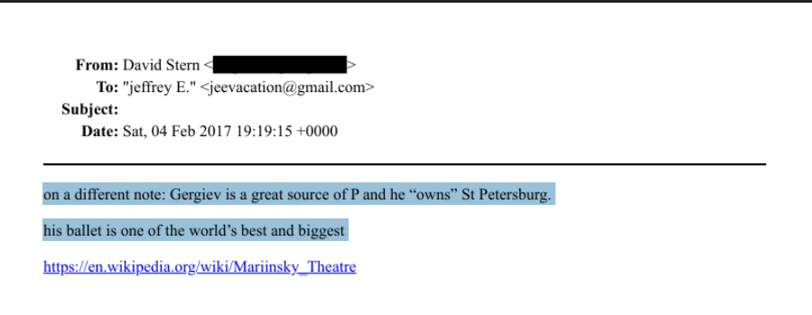 Валерий Гергиев, выдающийся дирижёр и руководитель Мариинского театра, фигурирует в переписке Эпштейна в контексте организации концертов. В октябре 2013 года помощница Эпштейна по поручению искала билеты на выступление Мариинского оркестра в Карнеги-холле.