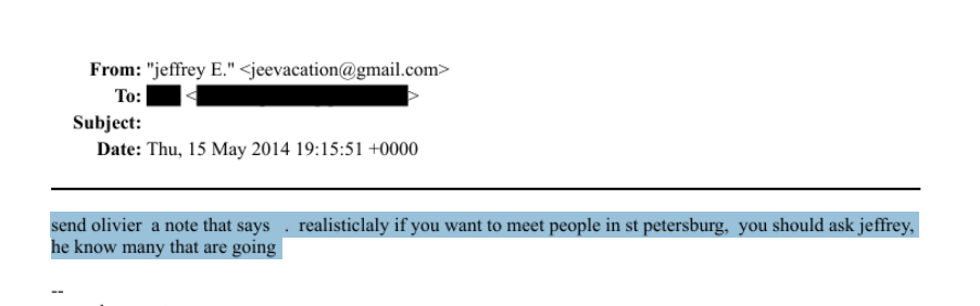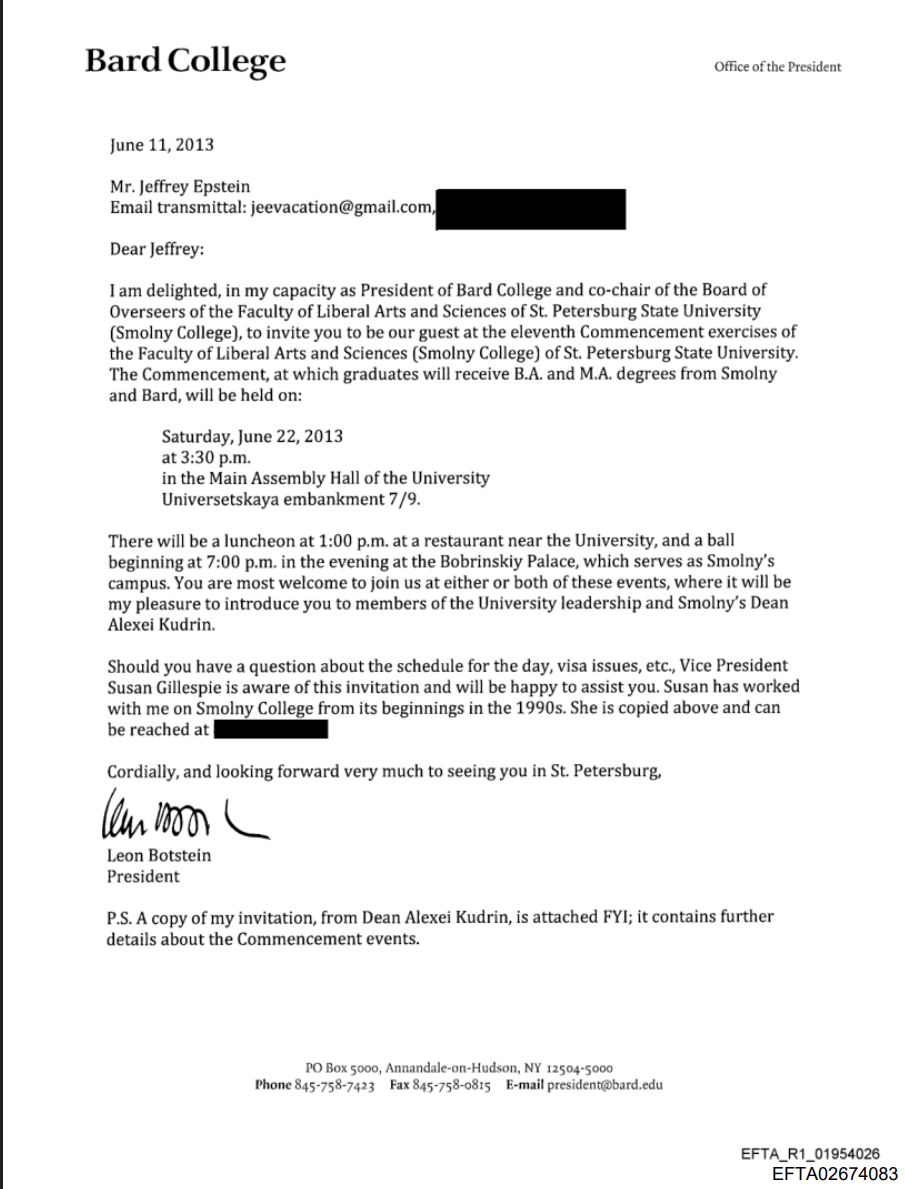 Санкт-Петербург упоминается в переписке Эпштейна около 1,5 тысячи раз, в основном в связи с бронированием перелётов и отелей. В 2013 году Леон Ботстайн приглашал финансиста на выпускную церемонию в СПбГУ, где могла состояться встреча с Алексеем Кудриным.