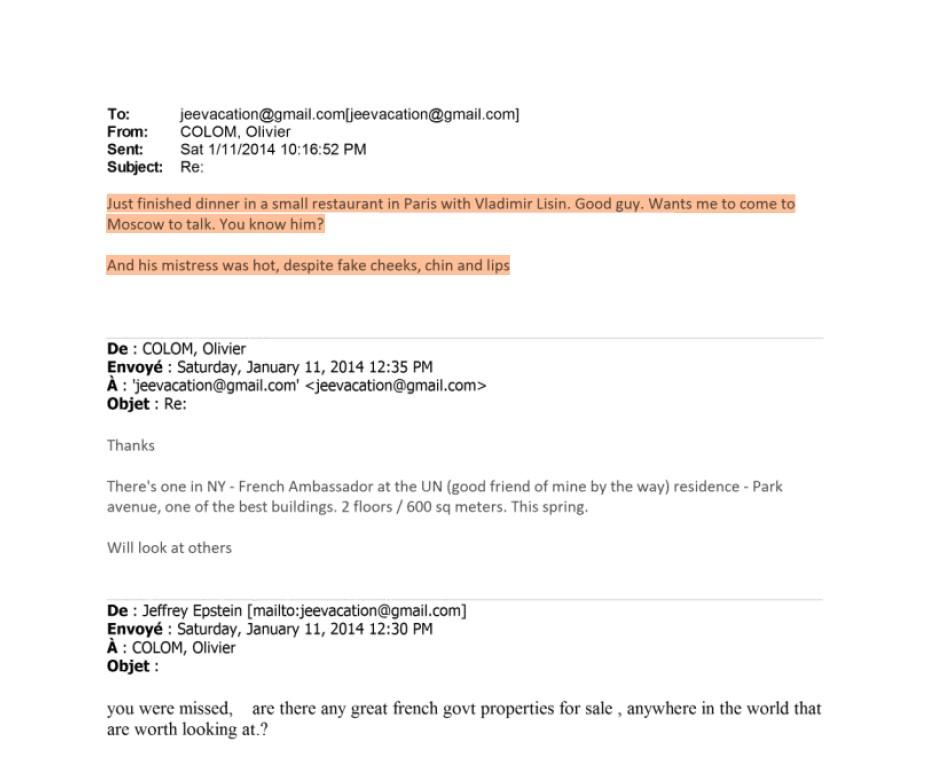 Имя миллиардера Владимира Лисина встречается в списках участников ПМЭФ-2011 и в переписке Эпштейна с Оливье Колома о совместном ужине в Париже. Прямых контактов между Лисиным и Эпштейном нет.