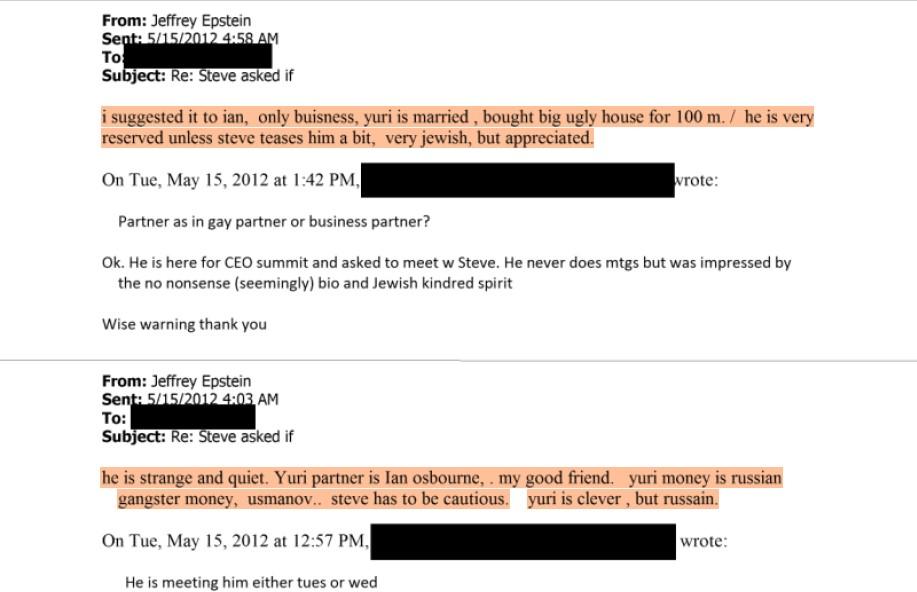 Алишер Усманов фигурирует в переписке 2012 года, где Эпштейн называет его источником «русских гангстерских денег» для Юрия Мильнера. В 2014 году обсуждалась отменённая встреча с Усмановым, но прямых контактов нет.
