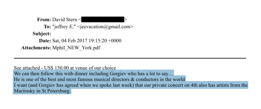 В феврале 2017 года обсуждался частный концерт Гергиева в Нью-Йорке, но планы не реализовались. В переписке его называли «владельцем Санкт-Петербурга» и «мощным источником влияния», однако прямого общения с Эпштейном не зафиксировано.
