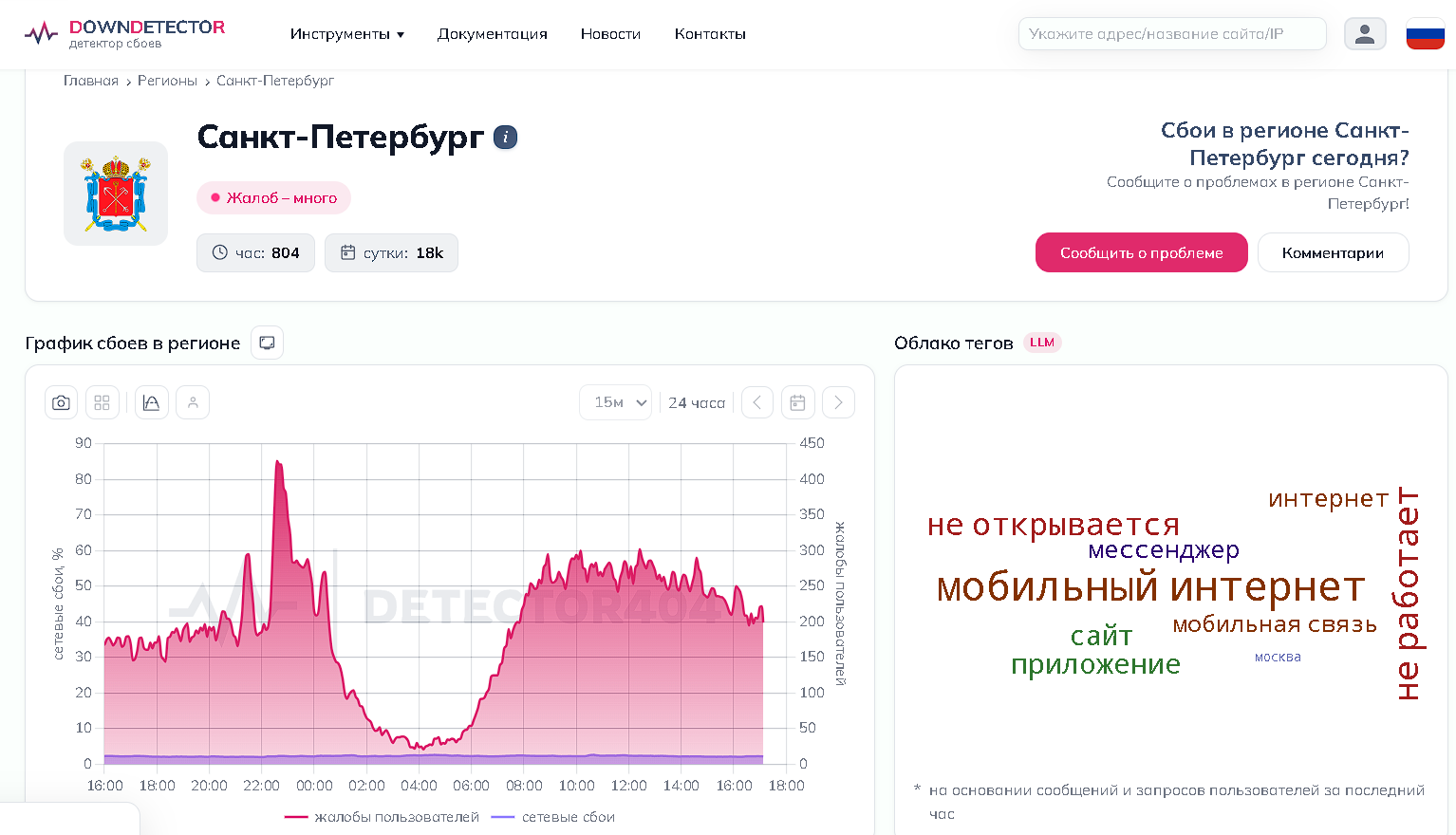 Жители Санкт-Петербурга в течение суток сообщили в Downdetector о проблемах с мобильным интернетом около 18 тысяч раз. Только за последний час было зарегистрировано 809 жалоб. Согласно данным графика, начиная с 8 утра, количество сообщений о сбоях практически не опускалось ниже отметки в 200.