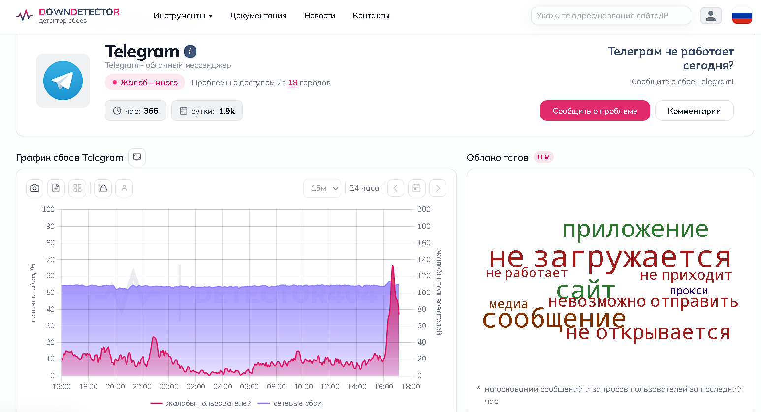 Сервис Downdetector, отслеживающий доступность онлайн-сервисов, зафиксировал резкий всплеск сообщений о неполадках в Telegram. За один час на портал поступило 365 жалоб из 19 городов. Наибольшее количество сообщений пришло из: