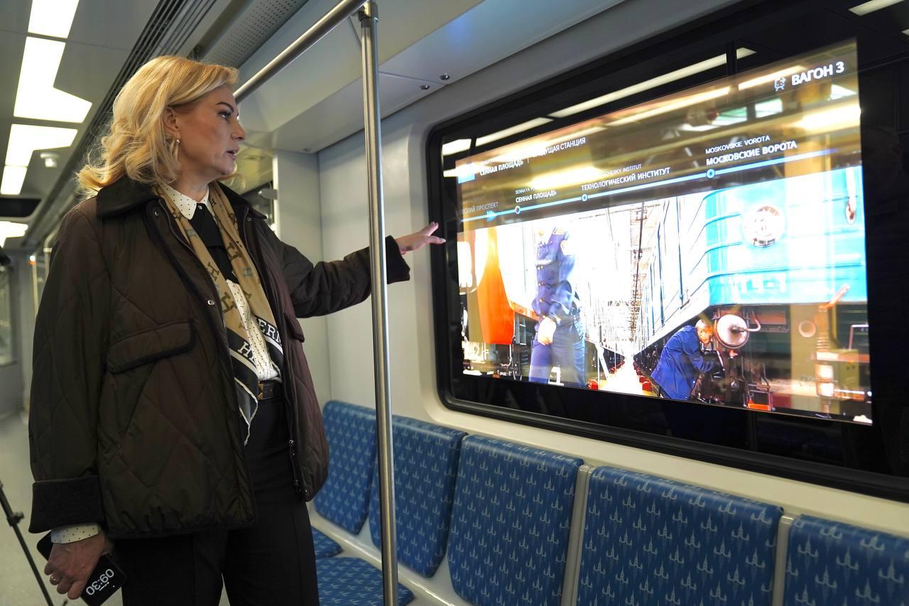 Одной из ключевых новинок стала установка медиаэкранов в окнах. Два таких дисплея размещены в третьем вагоне состава, который с 31 марта курсирует по синей линии.