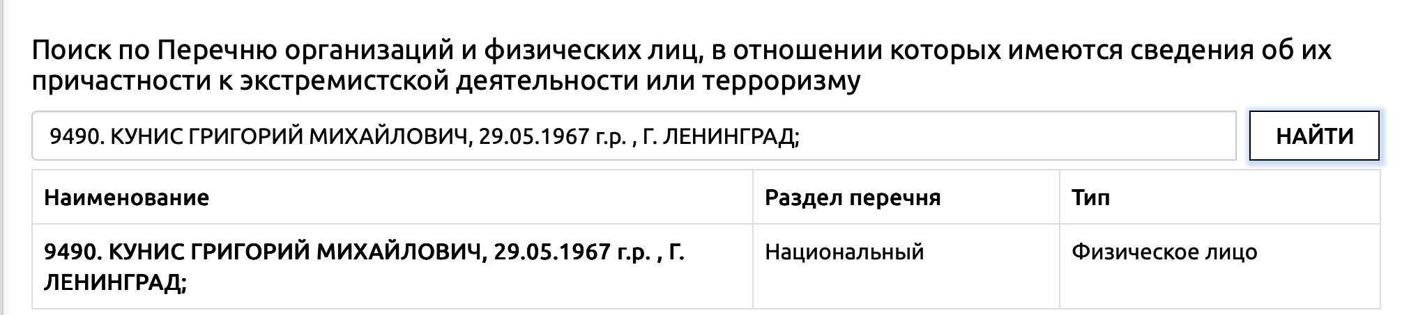Федеральная служба по финансовому мониторингу (Росфинмониторинг) добавила петербургского бизнесмена Григория Куниса в список организаций и физических лиц, причастных к экстремистской деятельности или терроризму. Соответствующая информация опубликована на официальном сайте ведомства.