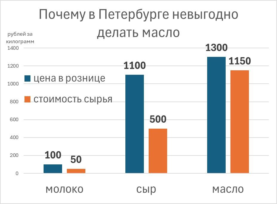 Экономическая причина этого дисбаланса проста. Для изготовления одного килограмма масла требуется 22–23 литра молока, а для килограмма сыра — 10–12 литров. При розничной цене литра молока около 100 рублей, килограмма сыра — 1100 рублей, а масла — 1300 рублей, производство масла становится малорентабельным. Особенно с учётом оптовой цены на сырое молоко в Ленобласти в 45–50 рублей за литр.