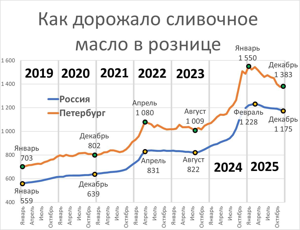 Цены на продукцию показывали резкий рост. Если в январе 2024 года килограмм масла в России стоил около 830 рублей, то к январю 2025-го цена достигла 1,2 тыс. рублей. В Петербурге в январе 2024 года килограмм стоил более 1000 рублей, а к январю 2025-го — уже 1,5 тыс. рублей. К концу 2025 года наметилась небольшая коррекция: в среднем по России цена снизилась до 1,175 тыс. рублей, в Петербурге — до 1,38 тыс. рублей за килограмм.