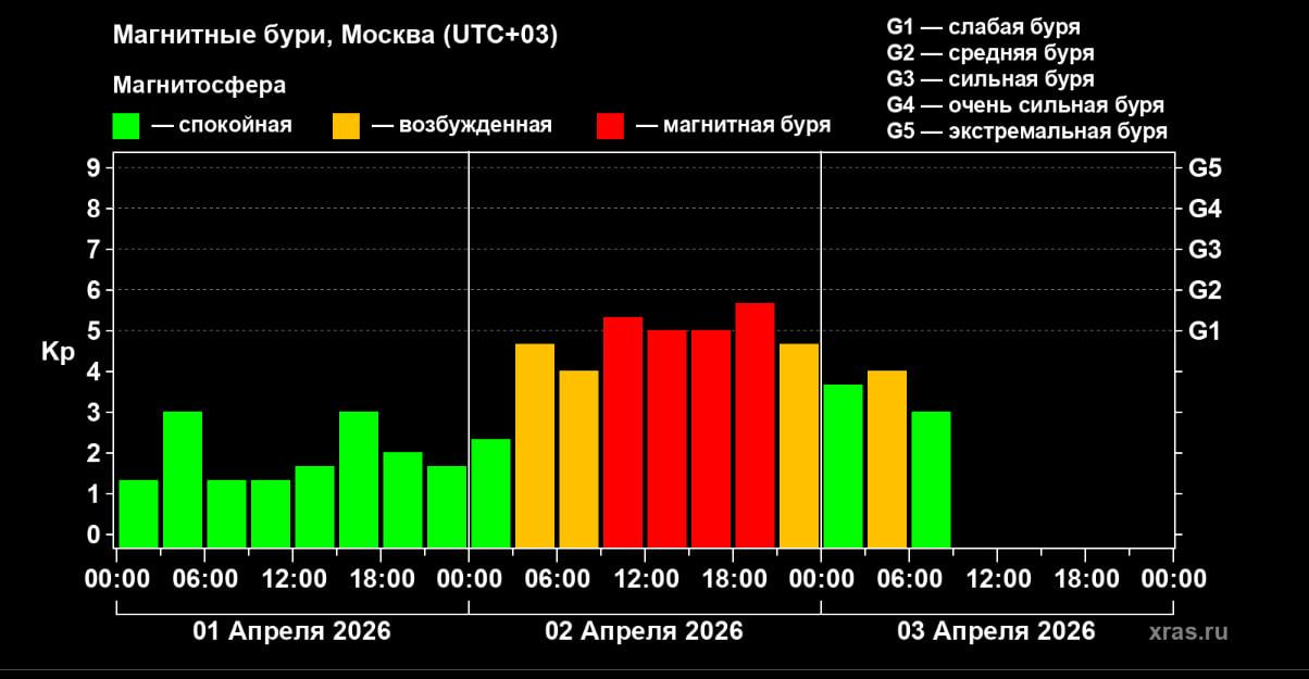Согласно информации лаборатории солнечной астрономии, магнитные бури начались днём 2 апреля, приблизившись к уровню G2. К ночи возмущения магнитосферы пошли на спад. Специалисты прогнозируют, что общая продолжительность составит около трёх суток, а в ночь с пятницы на субботу возможен новый всплеск из-за слабого выброса солнечной массы.